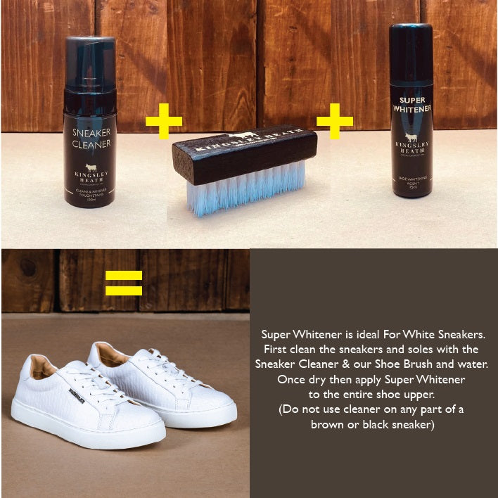 Super Whitener is ideal For White Sneakers– First clean the sneakers and soles with the Sneaker Cleaner and our Shoe Brush and Water. Once dry then apply Super Whitener to the entire shoe upper. (do not use cleaner on any part of a Brown or Black sneaker)